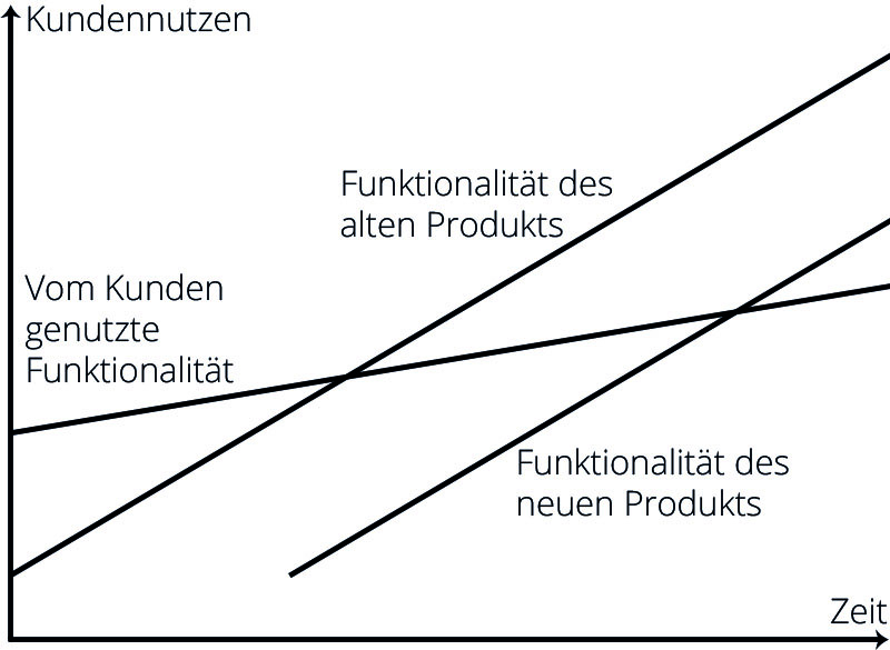 Für Christensen ist der Kundennutzen deshalb wesentlich wichtiger als die reine Funktion eines Produkts. Er argumentiert, dass ab einem gewissen Reifegrad Kunden gar nicht mehr alle Funktionen eines Produkts nutzen können oder wollen.